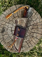 10.5” Damascus steel knife with 6” full tang blade with Ironwood handle. Hand sewn sheath with prairie rattlesnake insert in banded 6 oz leather.