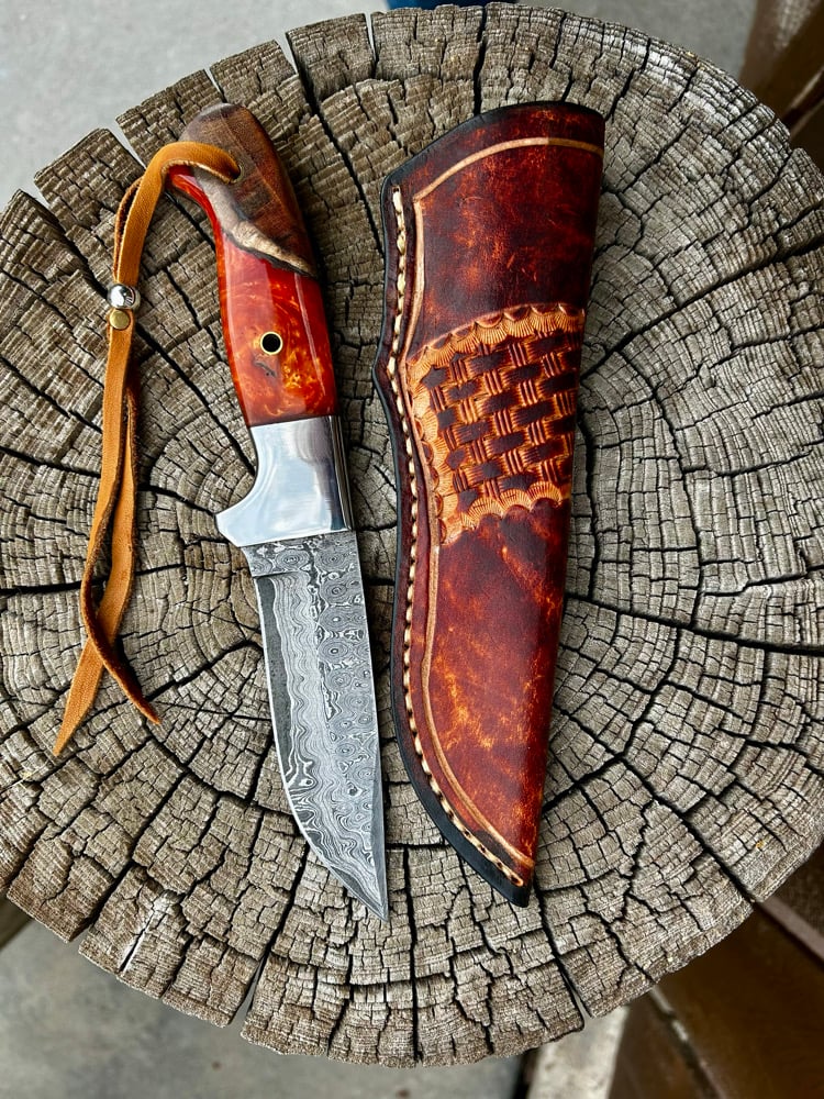 Teardrop Damascus steel 4.5” blade, 9” knife with olive wood and epoxy handle with full tang. Hand sewn and stamped 8 oz leather sheath.